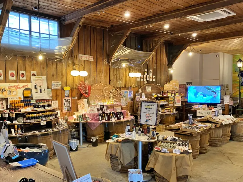 15年ほど前より、道内各地の食材を使ったしょうゆ加工品やドレッシングなどの商品開発に力を入れており、誕生した商品は1,200種類以上にもなります。それらの商品は、本社事務所に併設された直売店に、しょうゆ造りに使われた樽やしょうゆを搾る時の濾布(ろふ)を利用して並べられています。