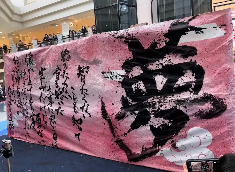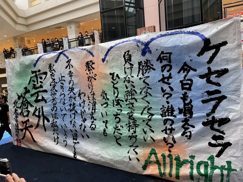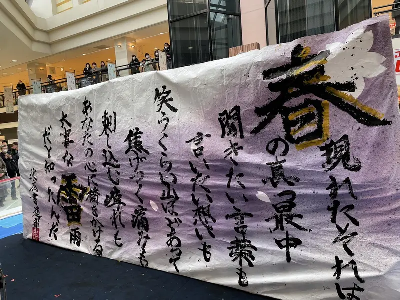 2024年1月7日(日)キャポ大谷地を会場に北広島高校書道部による書道パフォーマンスが行われた。商業施設の入り口正面、約10m四方のスペースの周りをたくさんの人が囲んでいた。2階からも多くの人がのぞいている。そしてスペース中央には北広島高校書道部が緊張の面持ちの中、開始時間を待っていた。ひとりひとりの顔を見て取材した日を思い出していた。持ち時間は40分、いざ開幕。