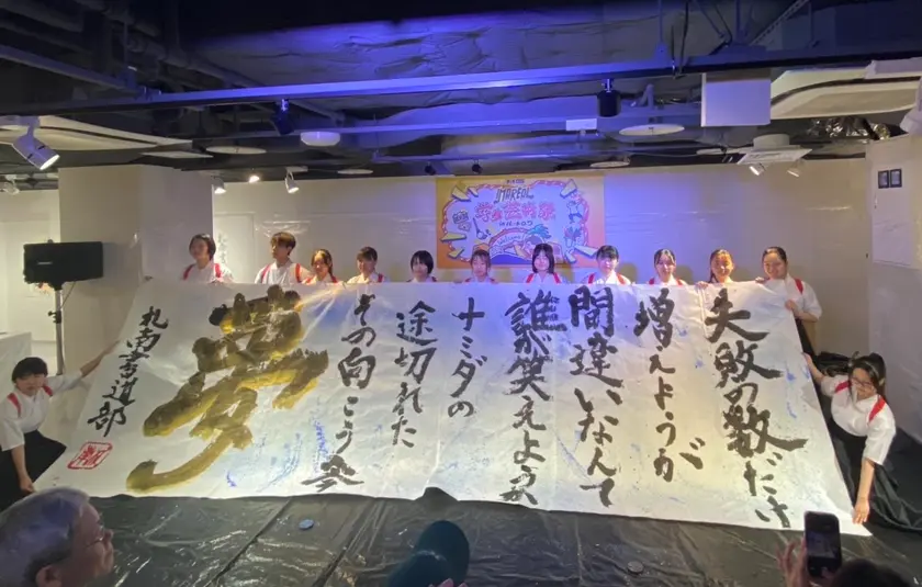 驚いたのは黒墨だけでなく、黄色の墨を作って、2本の筆を重ねて書いていたこと。さらに、霧吹きなども使い作品に彩りを加えていました。書道は自由だ!そう思わせてくれる素敵なパフォーマンスとなりました。札幌市内のイベントなどにも出演しているので、見かけた際には足を止めてあげてくださいね。