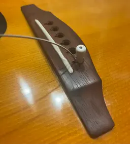 4.そしたら、新しい弦をポールエンド(輪っか)が横になるようにブリッジの穴に入れ、先ほど抜いたピンで固定します。ピンに溝がついているので、溝をヘッド側に向けて少し刺します。そこで弦を少し引っ張るとポールエンドが引っかかるので、それを感じたらピンを押し込みます。