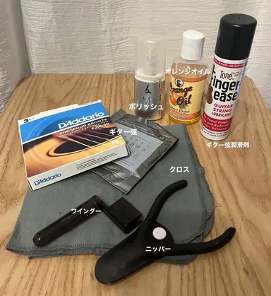 ギターのフレットなど金属パーツのサビや汚れを落とすためのポリッシュや、ギターボディ・ネック・指板の汚れを落とし乾燥を防ぐオイルなども用意すると◎。