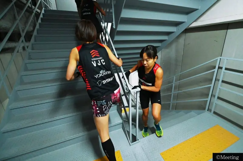 途中、わずかに踊り場が開けている階層部分で前の選手をかわして、