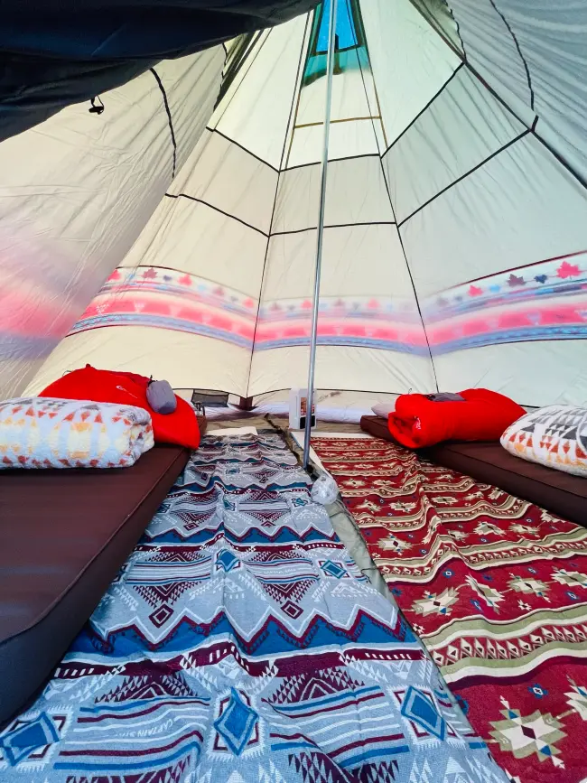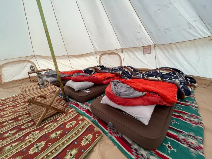 広々としたテント内には、エアマットやシュラフなどの寝具類が用意されています。