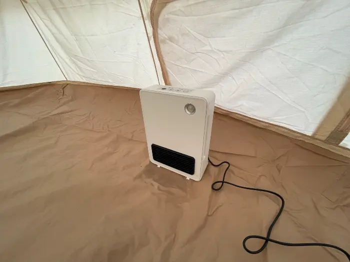 また、テント内には電源もあり、暖房はセラミックヒーターです
