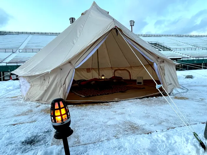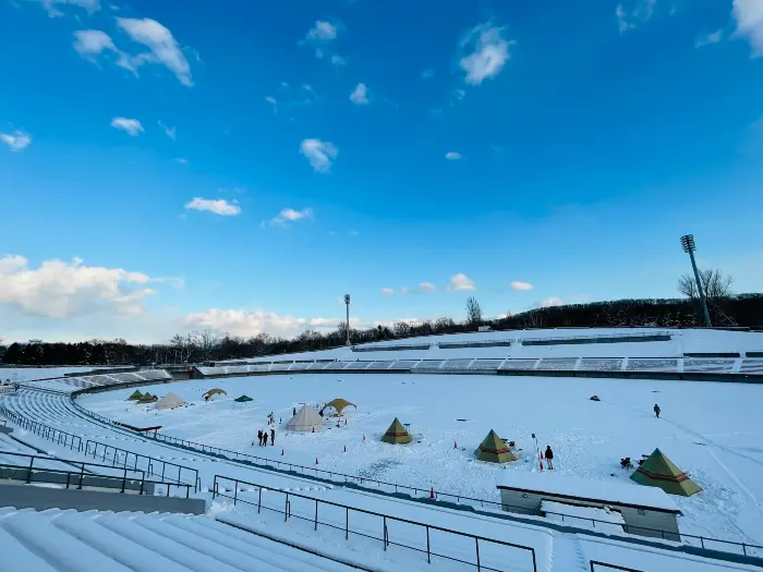 50年前の札幌冬季五輪の開会式も行われた「真駒内セキスイハイムスタジアム」(札幌市南区)。2023年1月7日(土)から2月5日(日)まで、冬キャンプが楽しめる「スノーキャンプフィールド2023」が開かれます。特別な場所に泊まれるだけではなく、初心者でも手軽に雪中キャンプが体験できるプランもあります。12月中旬に行われたモニターツアーを取材したので、どんなサイトなのか詳しく紹介します。