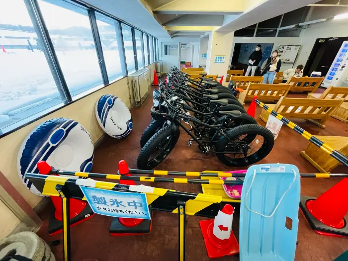 雪上でも走ることができるタイヤの太いファットバイクは1時間500円で借りることができます。
