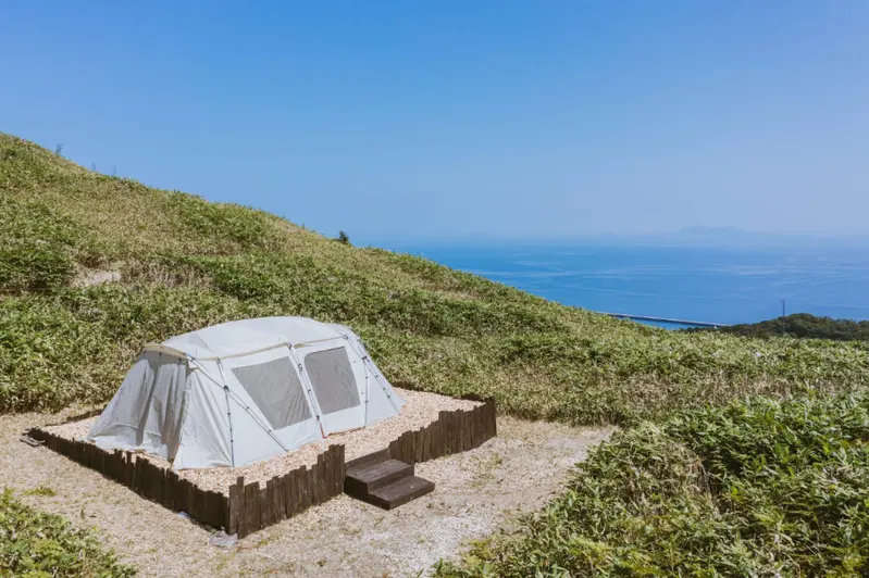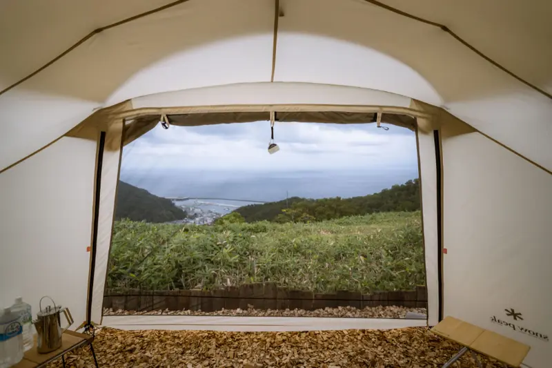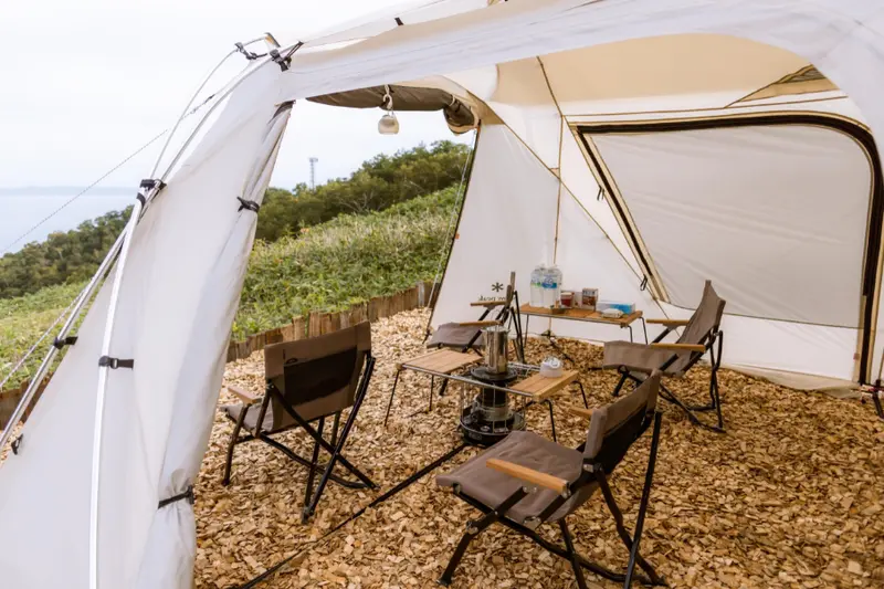 テントサイト4区画を配置。全区画でスノーピークのテントが設営されていて、テーブルやイス、寝具なども貸し出しており、手ぶらでキャンプが楽しめるのが特徴です。