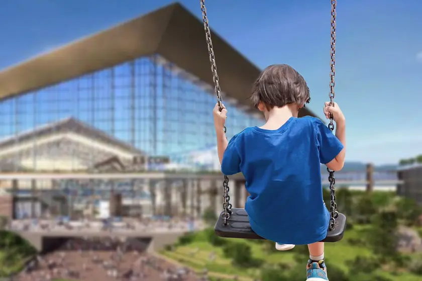 北海道日本ハムファイターズの新球場を眺めながら、大きく揺れる大型ブランコで、スリル満点です。風を感じて空に飛び出す感覚はまるでホームランボール!