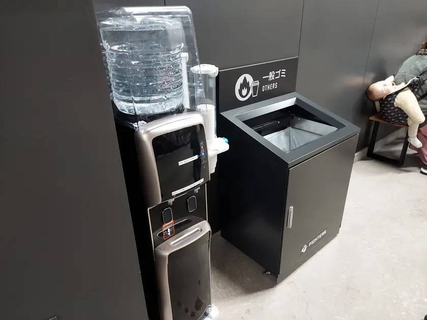 事前準備の持ち物でも紹介した「給水機(ウォーターサーバー)」が、施設内に設置されています。備え付けの紙コップのほか、持参したマイボトルにも給水できるので、必要に応じて使用してください。