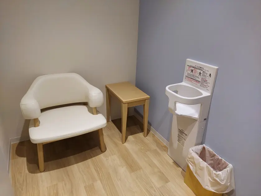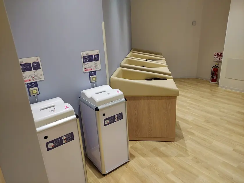 おむつ交換台、おむつ回収容器、鍵付き授乳室2〜3室、調乳専用浄水給湯器などが設置されていて、きれいで清潔感のある部屋です。