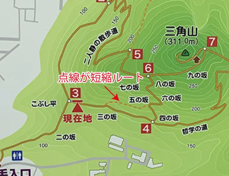 ちなみに、④を通過せず、「三の坂」から「六の坂」に向かうルートもあり、この短縮ルートを使う方が多いみたいです。(下図点線が短縮ルート)
