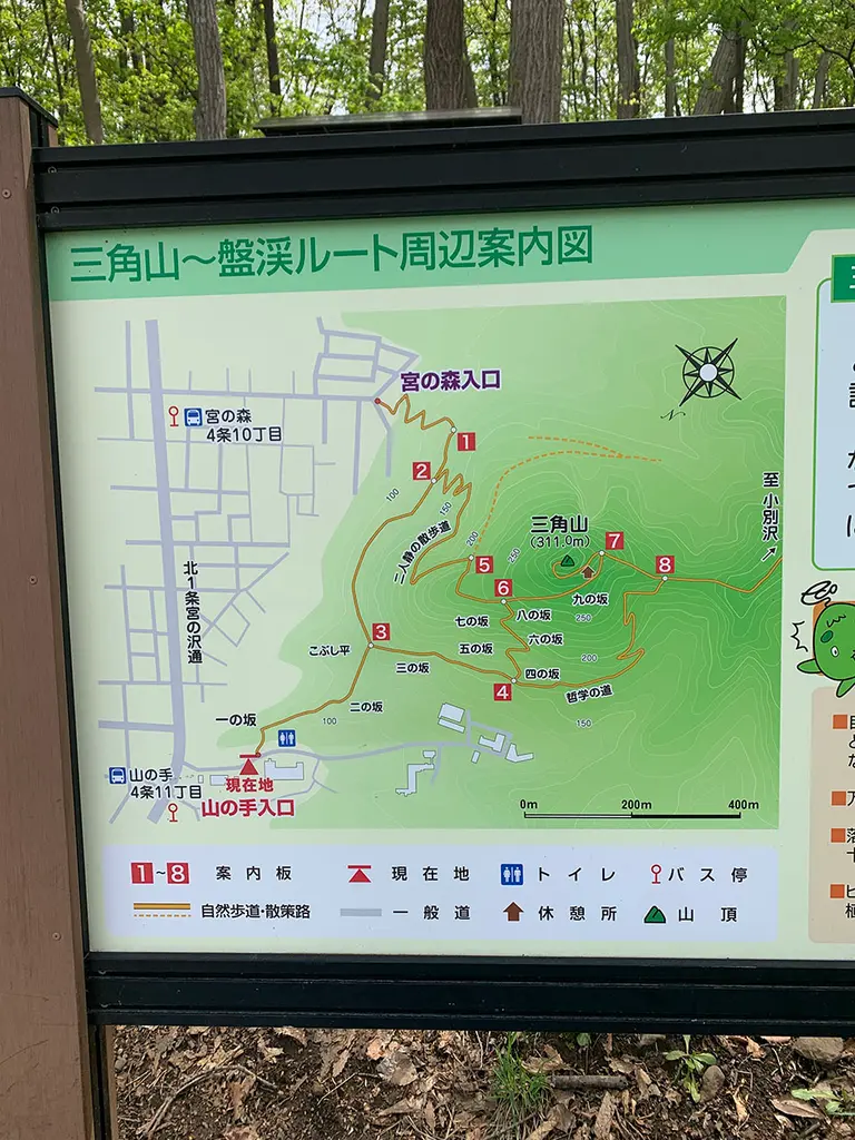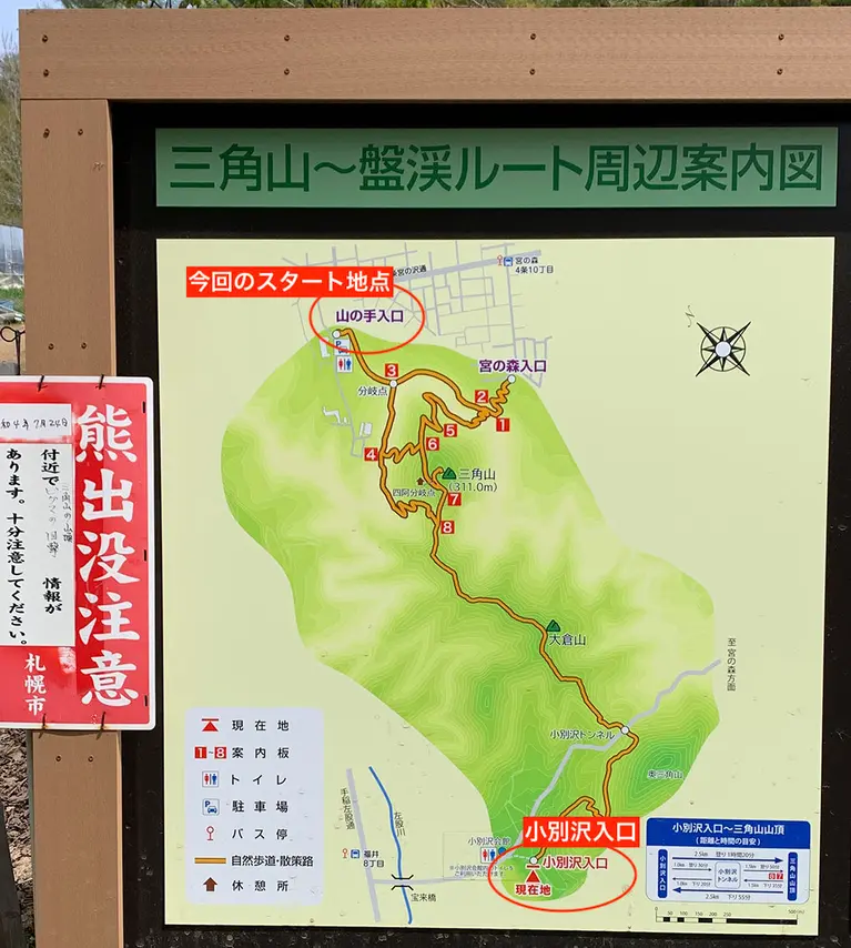 三角山には「宮の森入口」「小別沢入口」「山の手入口」の3つの登山口があります。このうち、おすすめは無料駐車場とトイレがある「山の手入口」です。近くに「宮の森入口」もあるので、無料駐車場やトイレが必要な場合は間違わないように注意してください。(意外と迷いやすい)