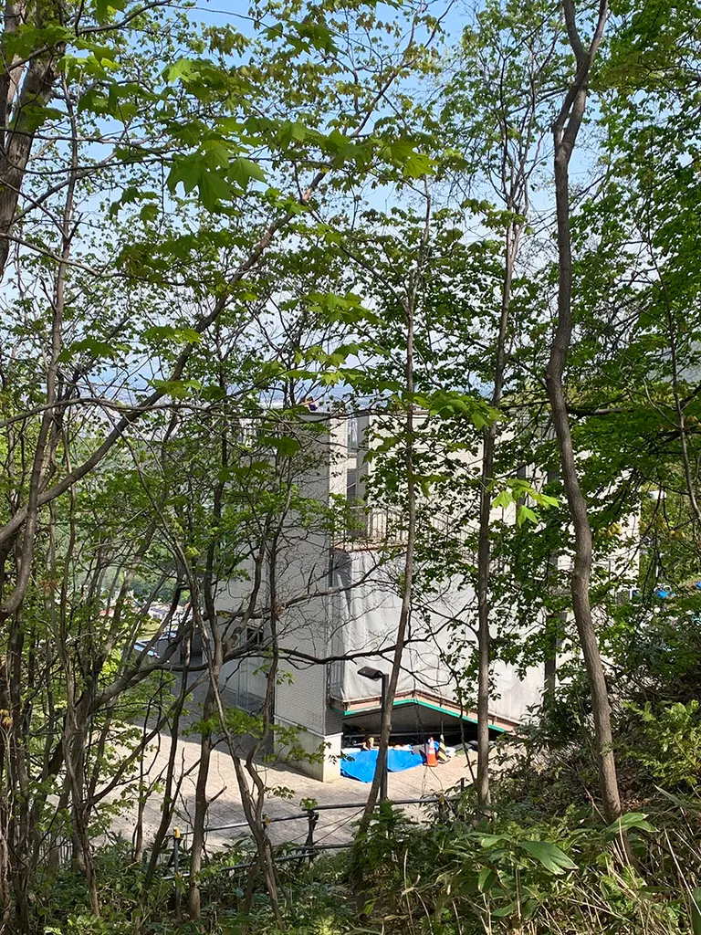 大倉山を歩いていると木々の奥に展望台が見えてきます。