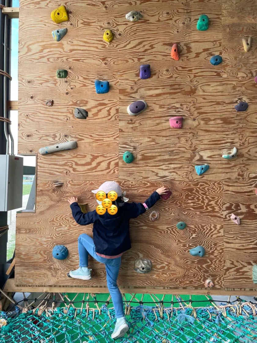 初心者にもできる、ボルダリングの壁もあって、娘も私もチャレンジ。下はトランポリンになっていたので、