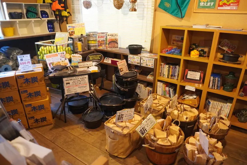 受付ではテントやタープ、キャンプ用ベッドなどのグッズレンタルのほか、バーベキュー用具もフルセットでレンタル可。