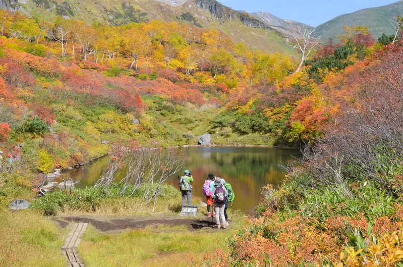 大雪高原沼群は上川にある沼群。大雪山国立公園内にあり、標高約1200〜1500m地点に位置します。日本有数の紅葉の名所の一つで、紅葉時期には多くの観光客が訪れます。大小80近い沼池があり、主要な沼池を抜ける形でアップダウンを繰り返しながら標高差約300mの登山道が設置してあります。入山無料。駐車場も無料です。ただし、紅葉のハイシーズンは、車両規制が行われるため、大雪湖から有料のシャトルバスを利用しなければなりません。