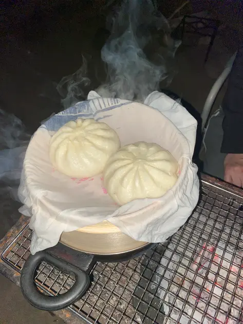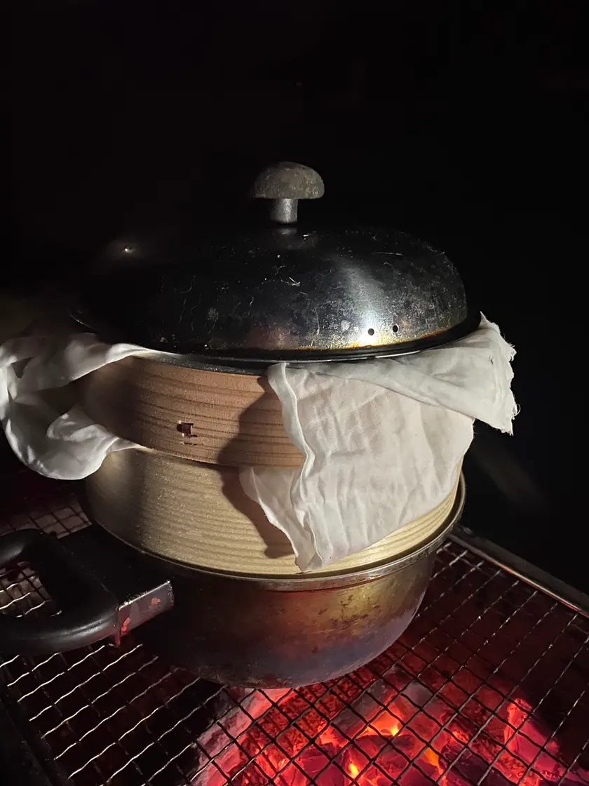スーパーで買った肉まんですが、セイロで蒸すとほかほかで、竹の香がほんのりとします。寒い戸外で食べるのは格別。