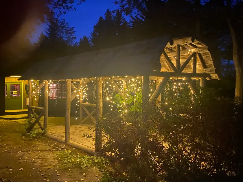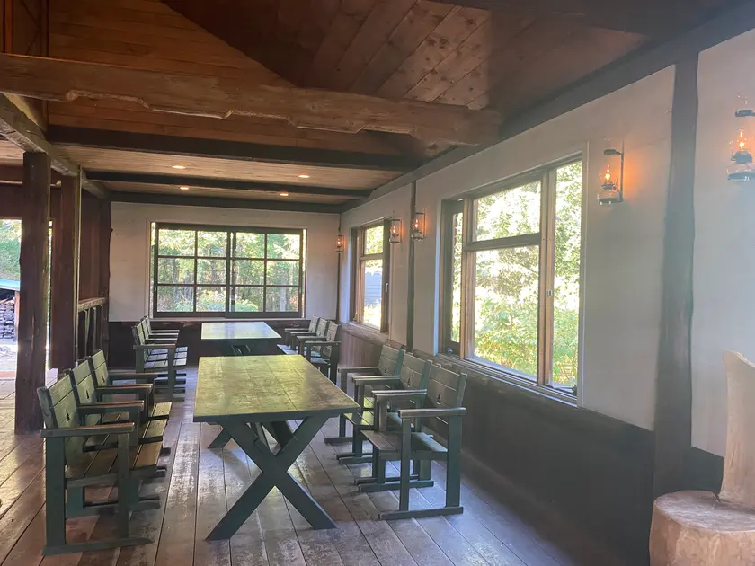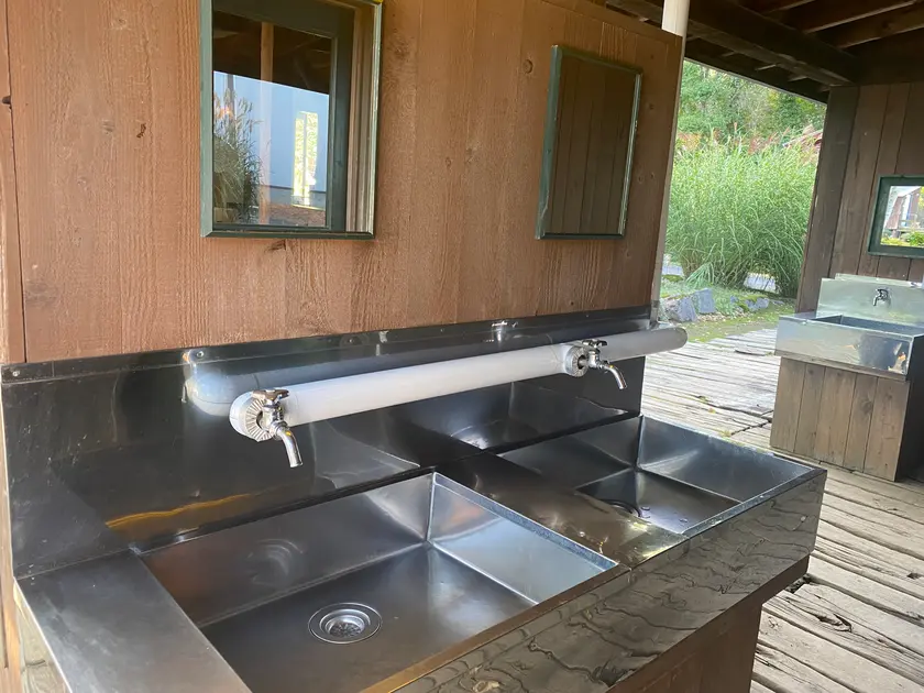 洗い物ができる場所になっています。調理台もあるので、下ごしらえもできます。いすとテーブルもあるのでここで食事もできますし、温かいので、夜寒くなったらちょっと逃げてくるのもいいですね。おしゃれな音楽が流れていて、特に夜は雰囲気がいいです。