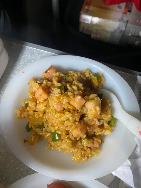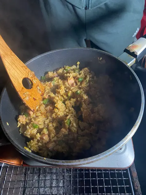 次のキャンプ飯は主人特製ジャンバラヤ。ご飯持参、野菜等も家で切ってほぼ家で下準備は済ませているので、ただ炒めるだけ。