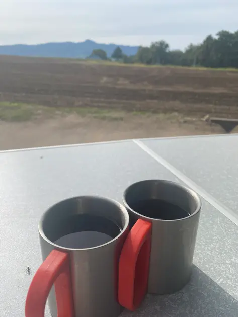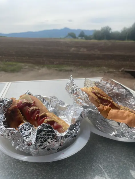 清々しい朝を迎えました。ちょっと食べすぎですが、飲みすぎることはなく体調はばっちり。朝食には、温めたパンにチーズ、炒めたソーセージをはさみ、ケチャップとマスタードで味付けしたホットドッグ。シンプルだけれども朝の空気とコーヒーでおいしさ倍増です。
