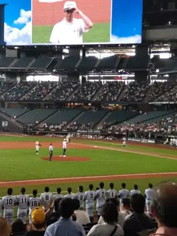 始球式はバッターヒルマン氏に対し栗山さんが投げた球を梨田さんが捕球するという元監督三人が登場するという粋な演出でした。