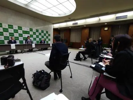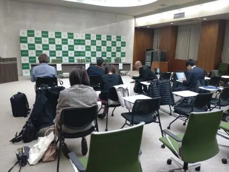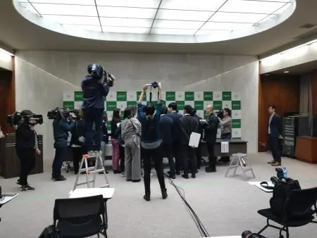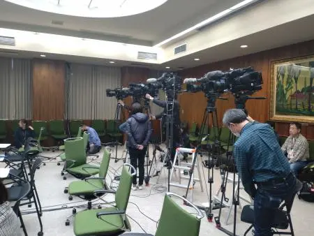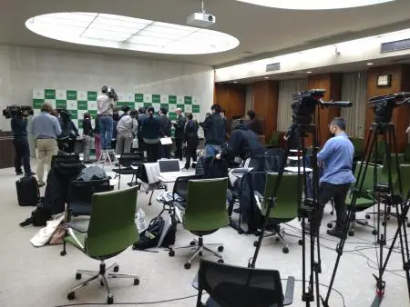 会見開始時間15分前に会場に入ってみると、報道の皆さんが早くもスタンバイ。
