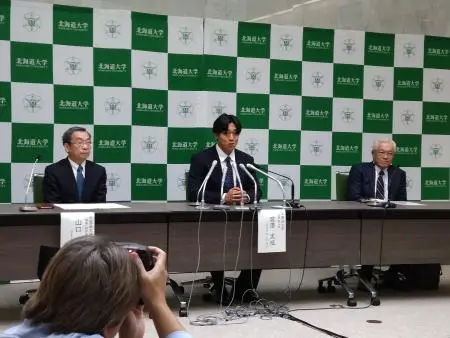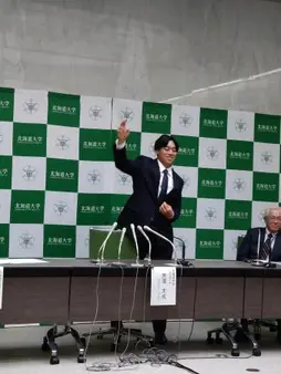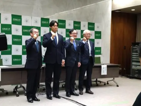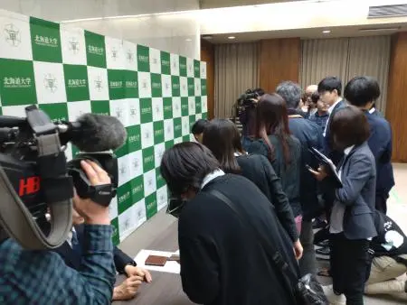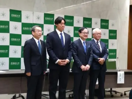 本人の他、北大の寶金総長、山口副学長、秋野監督が入場、まずは4人で報道陣が写真を撮る時間です。
