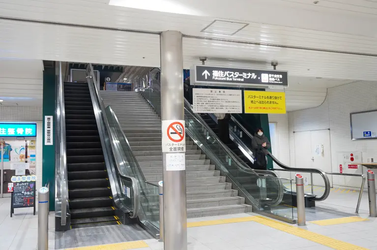 右手側に階段とエスカレーターがあるので、こちらを上に行けばバスターミナルです。
