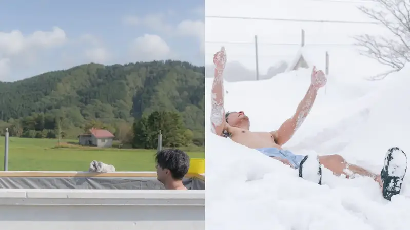 サウナ体験後は、開放感あふれる水風呂でクールダウンを味わえて、冬場の時期には目の前に積もった雪山へダーイブ!