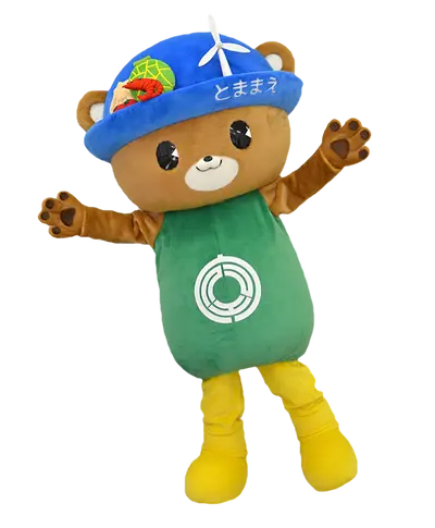 永遠の7歳「くまだ とまお」ベアー!ヒグマをモチーフにしており、青い帽子には風のまち苫前の風車、海や山の幸をPRしているベア。初対面の人にもあざといと言われる「とまお」の応援よろしくベアー!