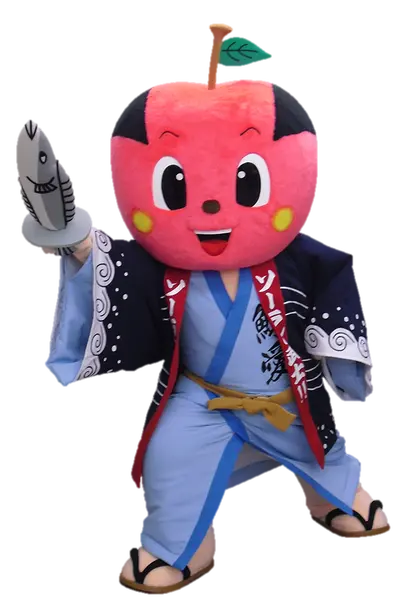 「ソーラン節」発祥の地・余市町の「ソーラン武士!!」です。頭は余市特産の真っ赤なりんご「あかね」、体はサムライ、腰には「ニシンの刀」。斬られると「幸せになれる」と話題だよ!!「武士!!君斬って~」とお声がけいただければ斬りまくります!