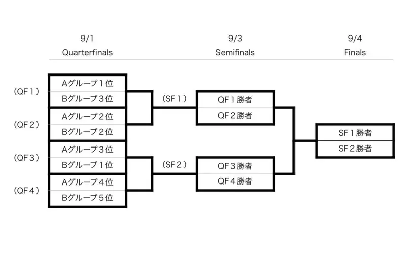 予選ラウンドを行ったのちグループAの5チーム+グループBの上位3チームの計8チームで決勝トーナメントが行われます。