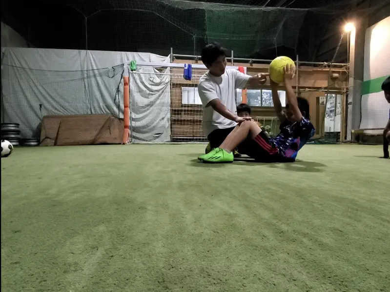 そして、最終的には、そのスポーツに近い動きで体幹トレーニングを行う事です。サッカーならば、片足に重心を置くことが多いので、片足を上げて、サッカーボールでキャッチボールです。相手を倒す勢いで投げるのがポイントです。上手くバランスを取りながらキャッチする事が強い体幹作りに繋がります。