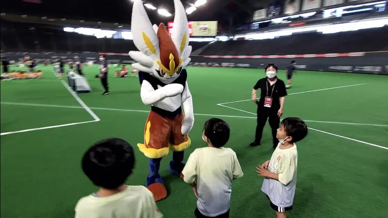子ども達は、内田キャプテンと共に来ていた!ポケモンのエースバーンに大興奮!