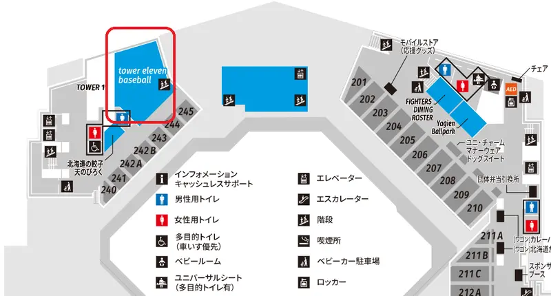 3塁側のF NEOBANK GATEから入場して左に進むと上りエスカレーターが1機あり「tower eleven baseball」の入り口まで行けます。そのほか、入場口から左に進んでTOWER 11まで行き、エレベータまたは階段で2階に上がっても行くことができます。(旧 tower eleven museumの場所です。)