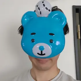 ちなみに、えふたんお面はその顔つきの通り、目がだいぶ下のほうにあって、目から顎までの長さが短いです。こどもが付けると目の位置も合ってちょうどいいサイズ感ですが、これを大人が付けて目の位置を合わせると・・・