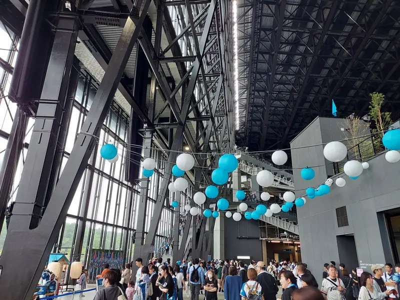 見上げると、頭上にも青と白の球体が吊り下げられていて、なんだかワクワクしてきます。