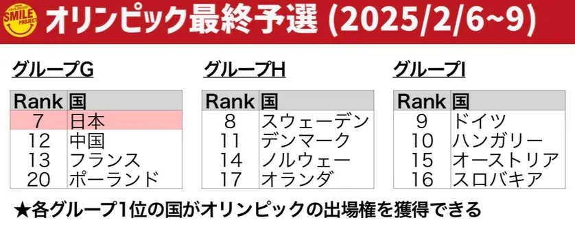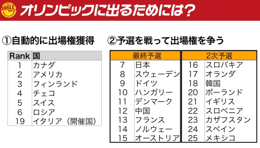 そのうち、世界ランキング1〜6位の国+開催国(今回の場合はイタリア)の計7カ国は、自動的にオリンピックの出場権を獲得することができます。