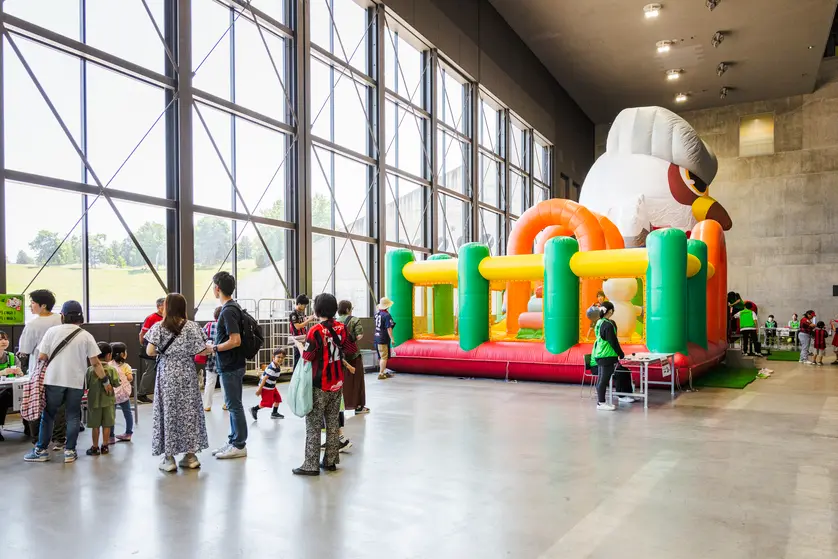 会場に入ると、子どもたちが1番に飛びついたのは、空気で膨らませた遊具の中に入って遊ぶ「ふわふわアドベンチャー」。3人はさっそく、くつを脱いで中に入り、階段を上ったり、坂を滑り降りたり、ピョンピョンと飛び跳ねてタッチし合ったり、と一瞬もじっとしていません。とびきりの笑顔で、楽しさが伝わります。