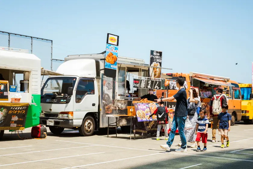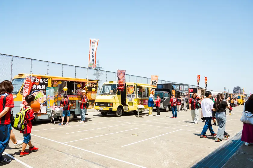 まずは、腹ごしらえ。キックオフは午後2時ですが、屋外テラスにキッチンカーが出店する「肉祭り2025」は午前10時から始まっています。優先入場は午前11時から、一般入場は午前11時半からですが、屋外テラスには入場開始前から入ることができるので、早めの空いている時間帯に利用するのがおすすめです。