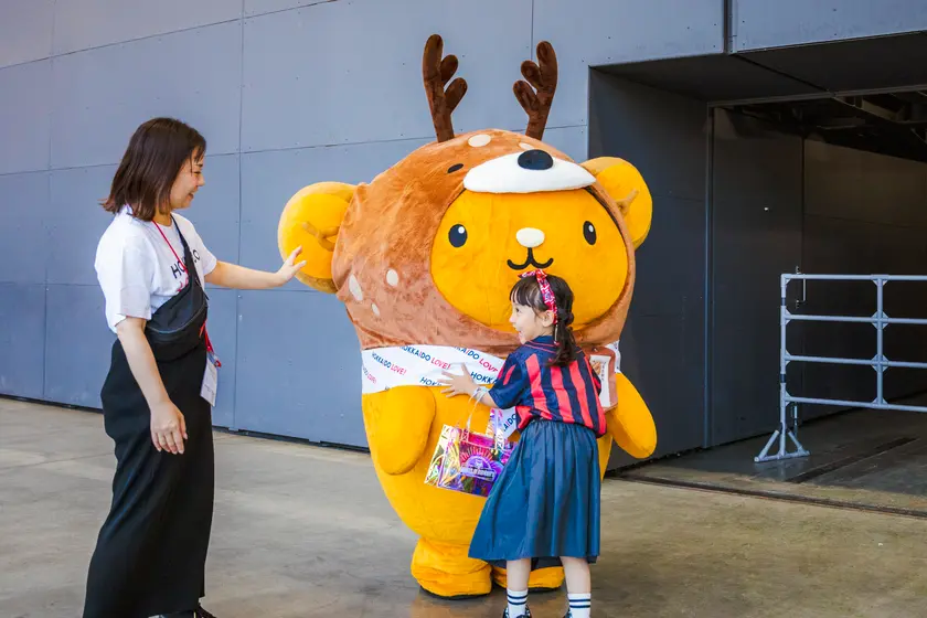 楽しく遊んでいるうちに、キックオフの時間が近づいてきました。この間にも、ピッチや屋外ステージでは、お笑い芸人の「銀シャリ」とコンサドーレの選手のトークショー、ゲストの熊本県営業部長兼しあわせ部長の「くまモン」や北海道観光PRキャラクター「キュンちゃん」のショーなどが開かれており、早めに入場しても退屈することはありません。