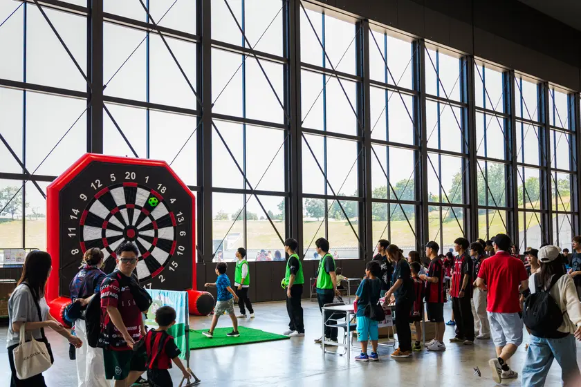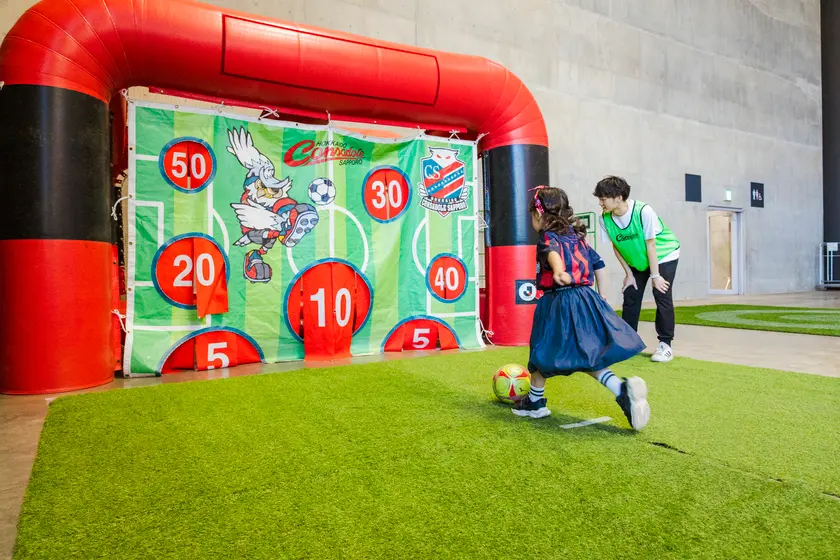 会場には、直径3メートルほどの大きなダーツボードめがけてボールを蹴る「フットダーツ」や5~50点の大小の穴めがけてボールを3球蹴り、合計得点を競う「キックターゲット」などのブースが並んでいます。