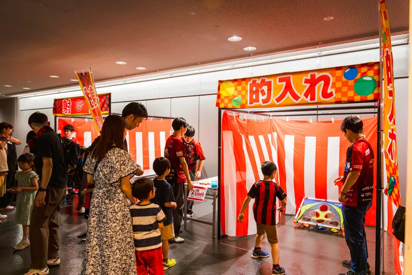 南ゲートの近くには、「コンサドーレ縁日」も出ていました。射的や型抜きなどの出店が並び、1回100円で遊ぶことができます。献人君は「水中コイン」に挑みます。水を張った水槽の中に沈められているコップや器めがけて、コインを落とすゲームで、3戦3勝!景品のお菓子を3つ、ゲットしました。夏鈴ちゃんも1回成功し、笑顔を見せていました。