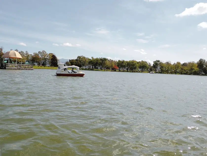 ただ、前日の雨のせいで芝生が水を含み、足元はぐちゃぐちゃ。2人のスニーカーはびしょ濡れになりました。持参したビーチサンダルが大活躍。さらにおすすめなのが鶴沼のスワンボート。初秋の湖面に紅葉が映り込み、まるで絵画のような風景。家族で漕ぎ出すと、非日常感たっぷりの時間を過ごせます。
