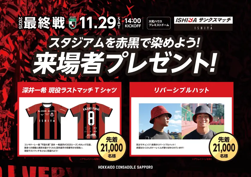 11月29日(土)の最終戦だけの来場者プレゼントとして、深井選手の背番号「8」とサインがプリントされた「深井一希 現役ラストマッチTシャツ」、赤黒の「リバーシブルハット」を先着2万1000名様にプレゼント!!