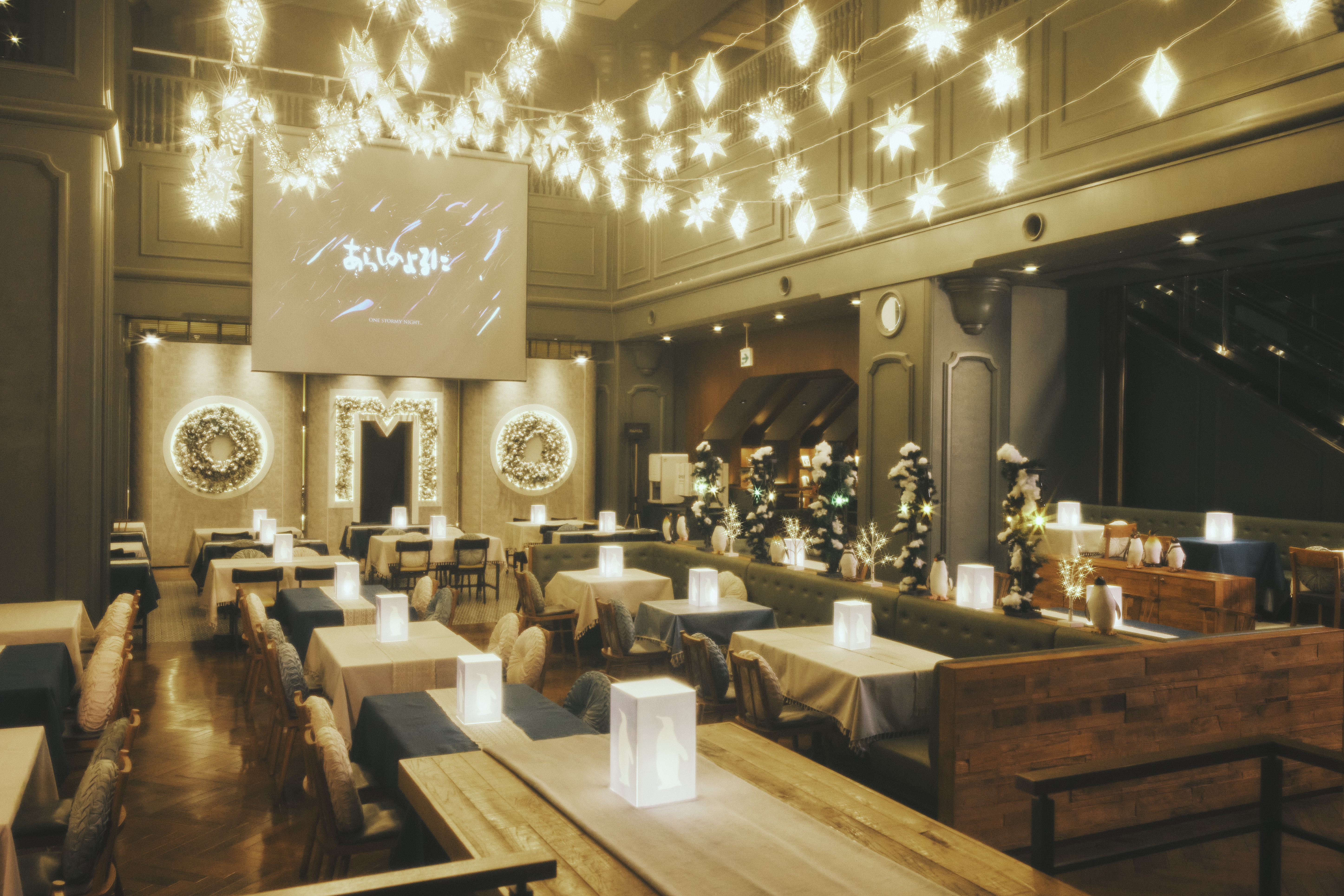毎晩30分、旭川出身の絵本作家あべ弘士氏と東京出身の絵本・童話作家きむらゆういち氏による絵本「あらしのよるに」をスクリーンで上映。映像や朗読、そして季節ごとに変化する空間装飾を通じて、物語の世界観に深く浸れます。