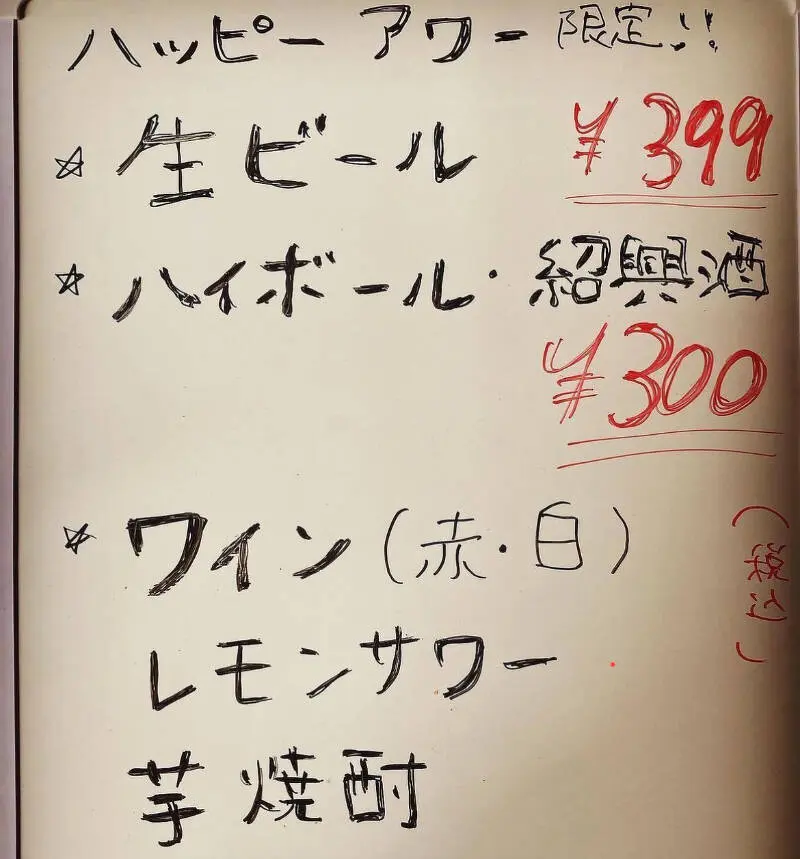 13〜17時までは「ハッピーアワー」でドリンクはこの価格。生ビール399円、ハイボール / 紹興酒300円、ワイン以降の飲み物も350円!!そして、この時間帯だけのリーズナブルなフードも5種類ほど。もちろんレギュラーメニューの注文も可能です。