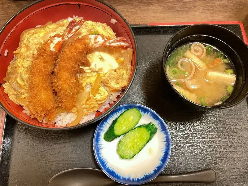 甘めのタレにシャキシャキ食感の玉ねぎと卵でとじたエビカツ丼も美味。