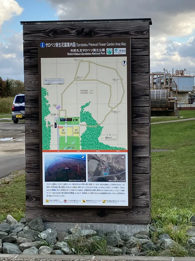 専務が、駅前の観光案内図でサロベツ原生花園に咲く花のイラストを見て、