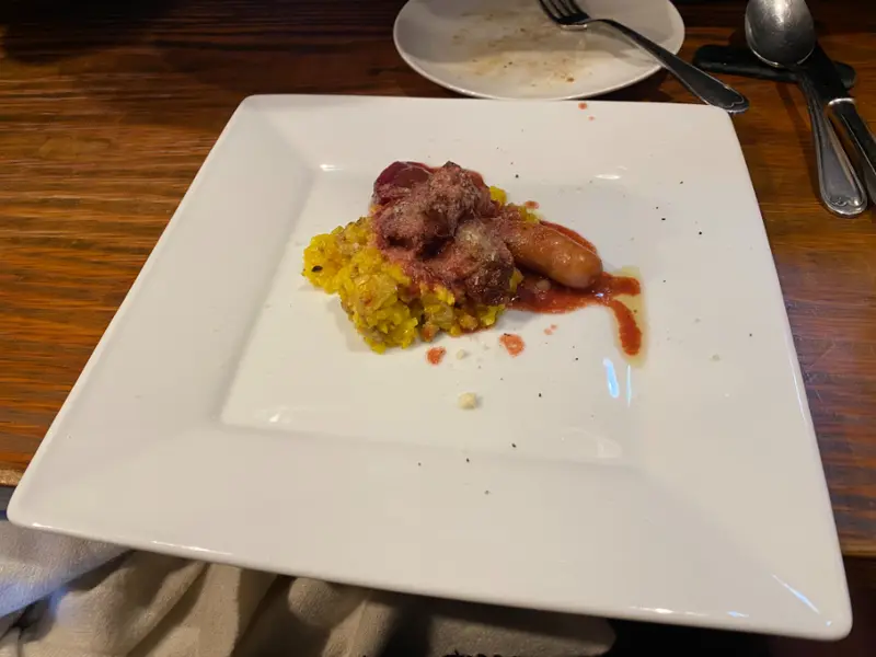 もう一つのメインは「栗のサフランリゾット 塩漬豚バラ肉、黒豚フランク、ビーツの煮込み添え(1800円)」です!